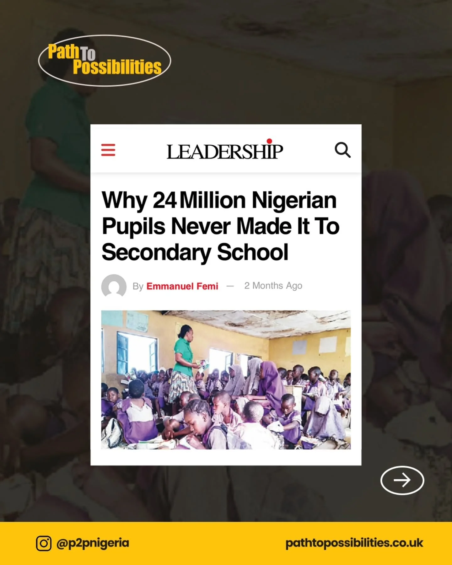 Path to Possibilities is a UK registered Charity organization breaking the cycle of poverty through education in Nigeria.